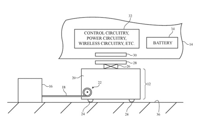專利顯示,該設(shè)備可以攜帶用于傳輸電力的物理連接電源線,或者可以使用基于線圈的無線充電系統(tǒng)。該裝置還可以通過電動(dòng)機(jī)和車輪自行移動(dòng),并配有檢測系統(tǒng),可以避免地板上的任何障礙物。