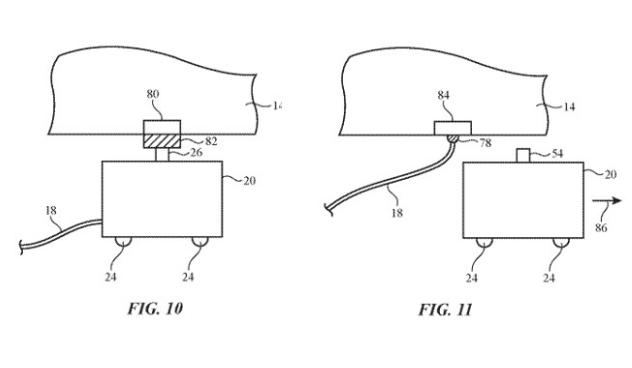 蘋果創(chuàng)建一個(gè)可以在地板上移動(dòng)的設(shè)備,一旦觸發(fā)就可以移動(dòng)。在移動(dòng)到位后,該裝置然后通過基座安裝的接收器向車輛供電。另一個(gè)觸發(fā)器可用于斷開設(shè)備并將其縮回。