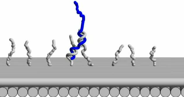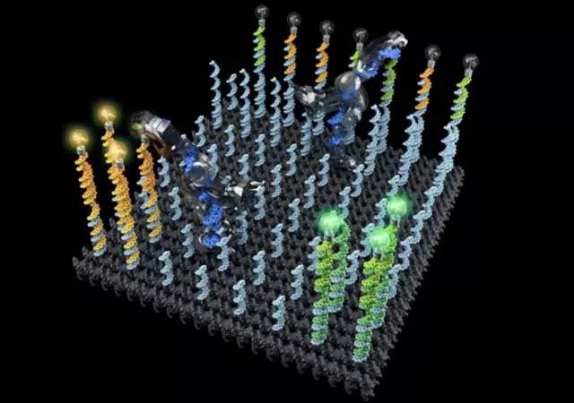 對(duì)DNA機(jī)器人進(jìn)行測(cè)試的場(chǎng)所是一個(gè)58納米×58納米的大分子表面,上面設(shè)置有上百個(gè)“樁子”。這些樁子是DNA機(jī)器人得以行走的重要幫手。每個(gè)樁子實(shí)則也是一條DNA單鏈,它們與DNA機(jī)器人的“腿”和其中一只“腳”堿基互補(bǔ)。換而言之,機(jī)器人DNA會(huì)和樁子結(jié)合,相當(dāng)于機(jī)器人“踩”在了樁子上。