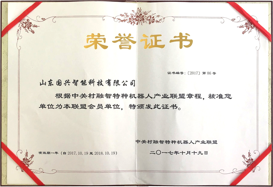 2017.10月,山東國(guó)興智能科技有限公司榮譽(yù)加入中關(guān)村融智特種機(jī)器人產(chǎn)業(yè)聯(lián)盟!?。?/p>