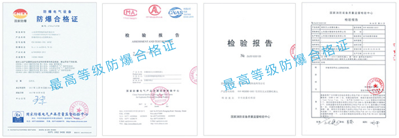 該系列整機產(chǎn)品獲得了國家防爆認證中心的防爆合格證書。是國內(nèi)唯一的,最具權(quán)威、最高等級的防爆合格證書。其中的電機、云臺、氣體檢測、智能消防水炮等所有配件均通過國家防爆認證,成為國內(nèi)真正通過防爆認證的特種機器人,自主研發(fā)的防爆電池管理系統(tǒng)及軟件,大功率驅(qū)動器、電機等產(chǎn)品使防爆級別遙遙領(lǐng)先國內(nèi)同類產(chǎn)品,并全部獲得國家發(fā)明專利。國興智能始終把安全和生命放在產(chǎn)品的首位, 以人為本,臻于至善的精神貫穿防爆產(chǎn)品始終!