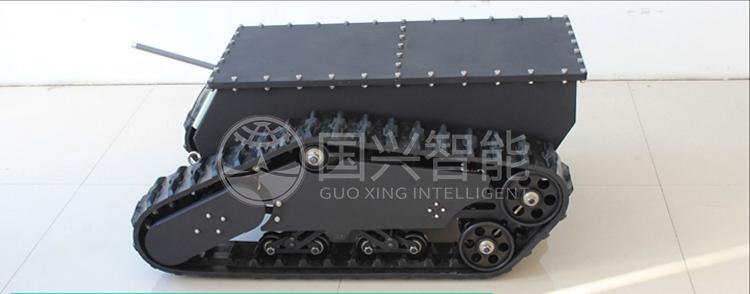 防護型履帶式底盤PLT-1000能夠成為武器設(shè)備搭載平臺,與其優(yōu)越性能、卓.越品質(zhì)以及非常強的通用性有著密不可分關(guān)系。首先,防護型履帶式底盤PLT-1000是智能移動機器人基礎(chǔ)研究的載體,可搭載機械手等搬運設(shè)備、武器設(shè)備、消防設(shè)備、搶險設(shè)備,擁有寬大的內(nèi)艙空間,使其通用性增強;其次,機器人底盤采用防水設(shè)計,底盤材料和結(jié)構(gòu)均采用防水設(shè)計,外置電器元件也采用防水設(shè)計,不受下雨天氣、涉水環(huán)境影響行駛;第三,獨立懸掛減震系統(tǒng)性能可靠,可適應重載避震,實現(xiàn)顛簸路面平穩(wěn)行駛;第四,電機采用低壓直流電機,動力強勁,具有較高的負載能力和牽引能力;第五,動力控制系統(tǒng)采用低壓直流控制系統(tǒng),閉環(huán)控制,可實現(xiàn)精準控制和定位,滿足控制精度要求;第六,機動性強,重心位置低,具有一定的越障和爬坡能力,并能夠?qū)崿F(xiàn)負載越障;第七,轉(zhuǎn)彎半徑小,可實現(xiàn)原地轉(zhuǎn)向,移動靈活、速度快,且速度可調(diào);第八,行走部分采用橡膠履帶,具有接地比壓小、附著條件好、路面適應能力強、維護方便等特點。