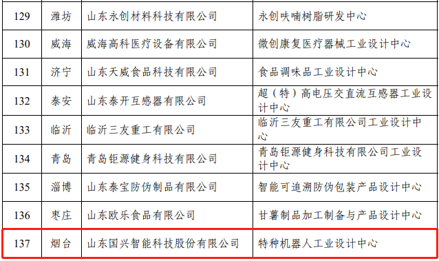 近日,山東省工業(yè)和信息化廳發(fā)布第七批省級工業(yè)設(shè)計中心名單,山東國興智能科技股份有限公司的“特種機器人工業(yè)設(shè)計中心”成功入選。